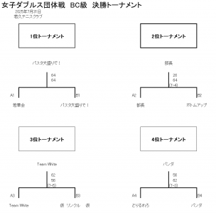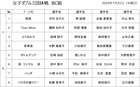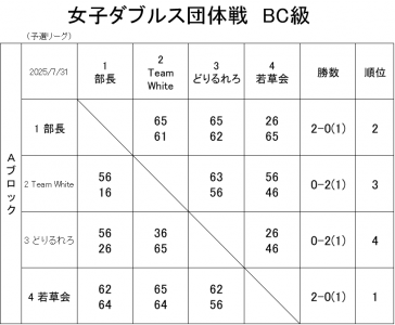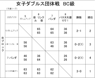 若久カップ 女子ダブルス団体戦(BC級) 7月31日(木) 試合結果