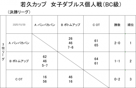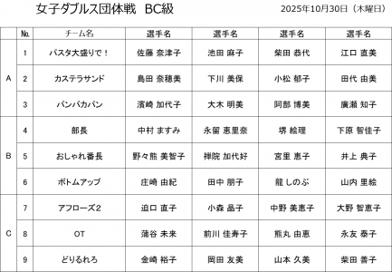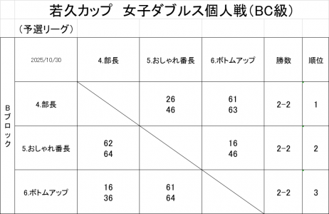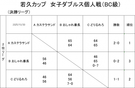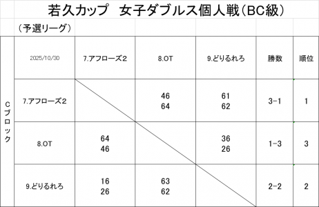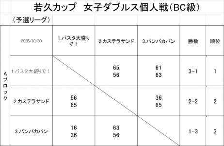 若久カップ 女子ダブルス団体戦(BC級) 10月30日(木) 試合結果