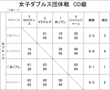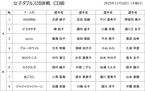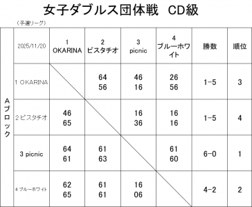 若久カップ 女子ダブルス団体戦(CD級) 11月20日(木) 試合結果