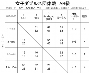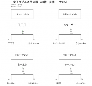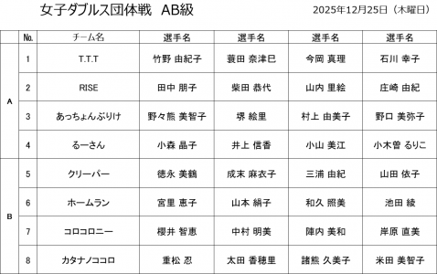 若久カップ 女子ダブルス団体戦(AB級) 12月25日(木) 試合結果